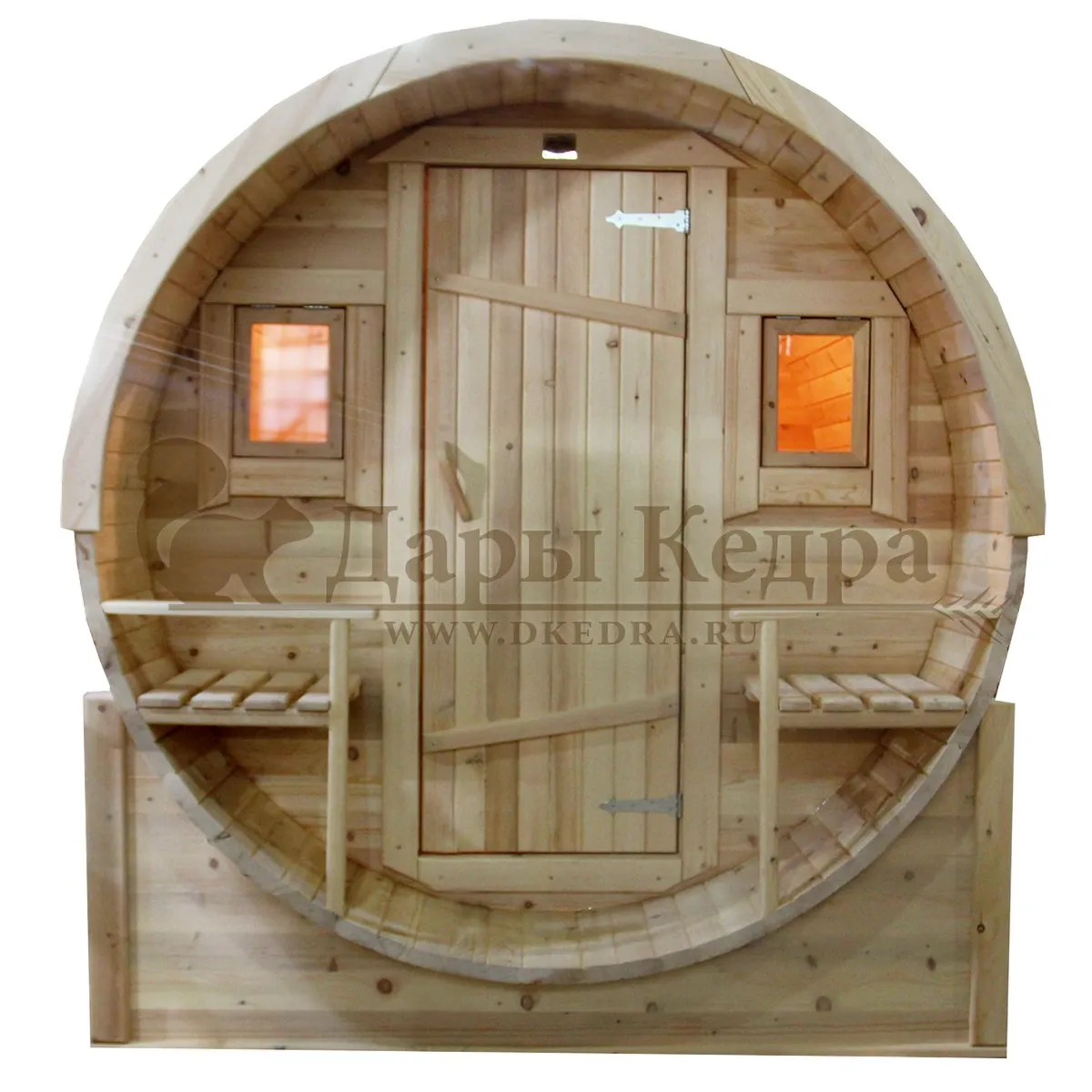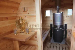 Это изделие круглой вытянутой формы с тремя отделениями: раздевалкой, моечной и парной. Во всех трех отделениях с обеих сторон установлены лавочки из кедра. Печь находится в парилке около дальней стены. Для удобства пользования в бане висят полочки из кедра и вешалка в раздевалке. Время растопки такой бани не превышает 30 минут. По вашему желанию баню-бочку можно дополнить печью с внешней загрузкой, благодаря которой весь мусор после топки останется на улице. Круглая баня-бочка не требует полноценный фундамент, поэтому при необходимости ее можно перенести в другое место.