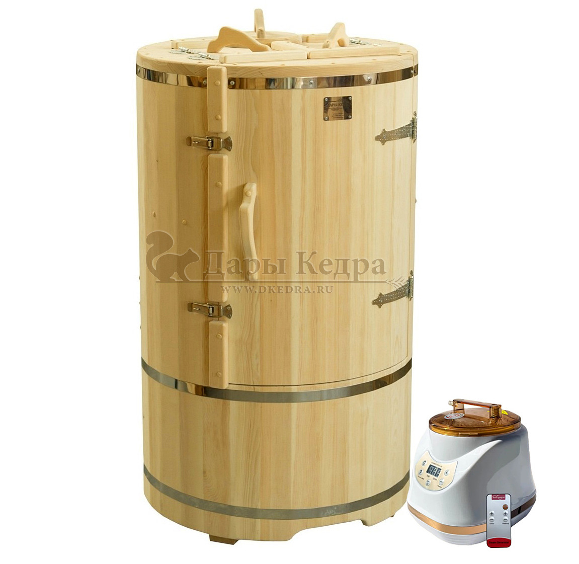 Готовый комплект - это полностью укомплектованный набор с фитобочкой для процедур парения. Круглая модель наиболее компактна и мобильна. Толщина стенок составляет 25 мм. Фитобочка оборудована откидными створками, дверцей и отверстием для головы. Во время парения человек сидит внутри кедровой бочки, а голова находится снаружи. Благодаря этому исключается возможность перегрева. Подлокотники из кедра, встроенные ручки на створках и двери делают эксплуатацию более удобной.
