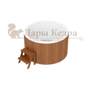 Это купель с круглой внутренней чашей, которая изготовлена из современного прочного и термоустойчивого материала (композита). Форма чаши обеспечивает комфортную посадку внутри изделия. Для удобного использования купель оснащена приставной лестницей. Обручи из нержавеющей стали декорируют купель с композитом и равномерно распределяют нагрузку во время процедур.